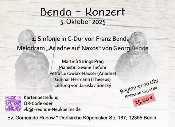 Wochenende 04./05.10.2025: Die Freunde Neuköllns e.V. feiern 30 Jahre Partnerschaft mit dem Stadtteil Smichov von Prag. Zu Ehren des böhmischen Komponisten Franz Benda findet am 05.10. um 17:00 Uhr ein Konzert statt.